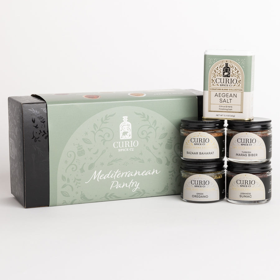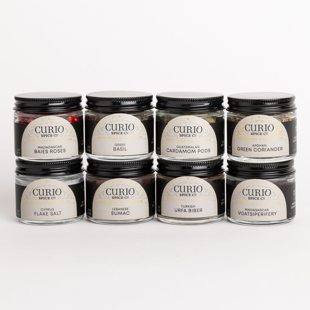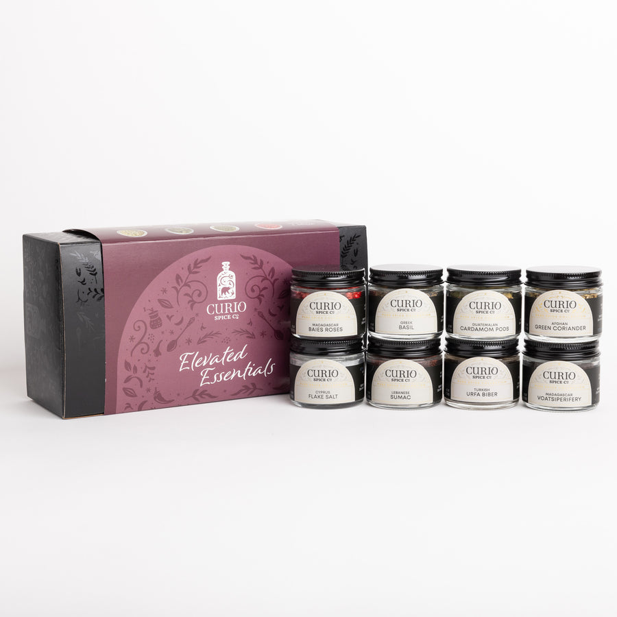 Curio Spice Co. gift wrap box, matte black with glossy details and sealed with a sticker that reads "Spices for the Curious Cook".