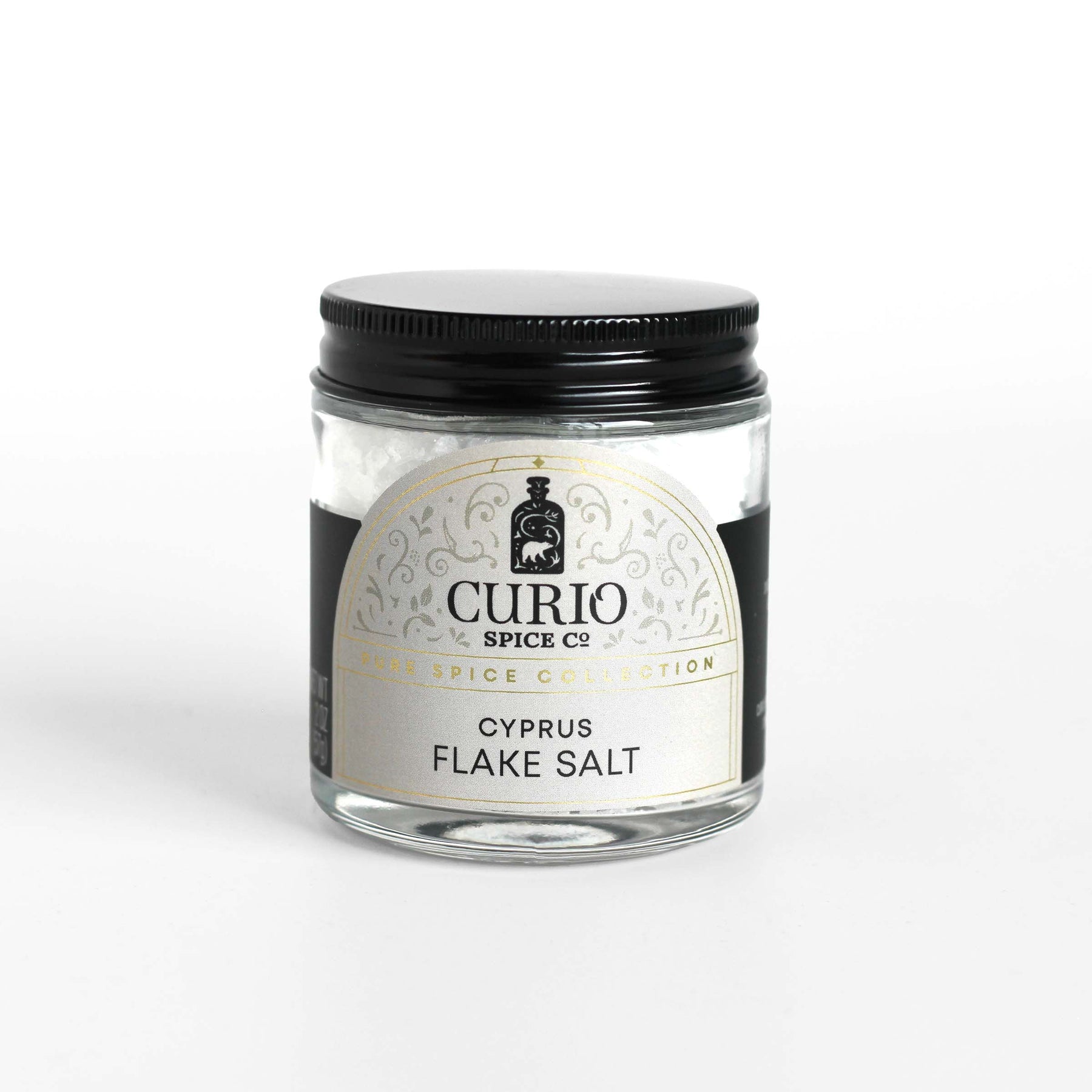 Curio Spice Co. fair-trade single origin sustainable Cyprus Flake Salt in glass jar.