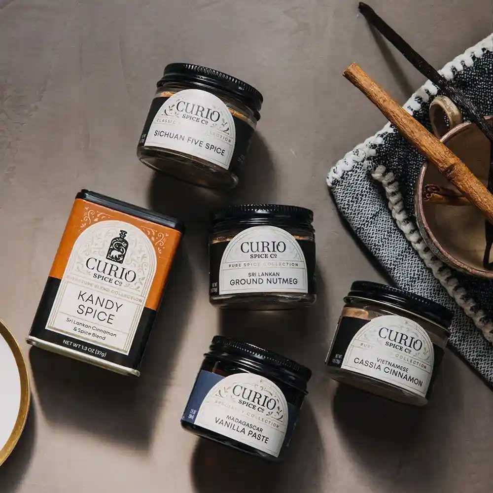 Up your baking game and perfume your kitchen with these aromatic spices, great for experts and beginners alike! Includes baking essentials like ground nutmeg, cinnamon, and vanilla paste, along with sweet, bright Sichuan Five Spice and Curio's Signature Kandy Spice blend. Try making our Kandy Spiced Pumpkin Cookies, or Dark Chocolate Five-Spice Cake. And, of course, there's nothing like freshly grated nutmeg for apple or pumpkin pie!