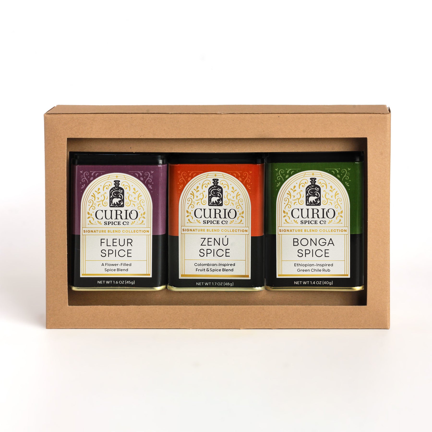 Curio Spice Co. 3-Tin Spice Garden Signature Blend gift set featuring unique spice blends made fair-trade single origin sustainable spices, featuring Fleur Spice, Zenu Spice, and Bonga Spice.
