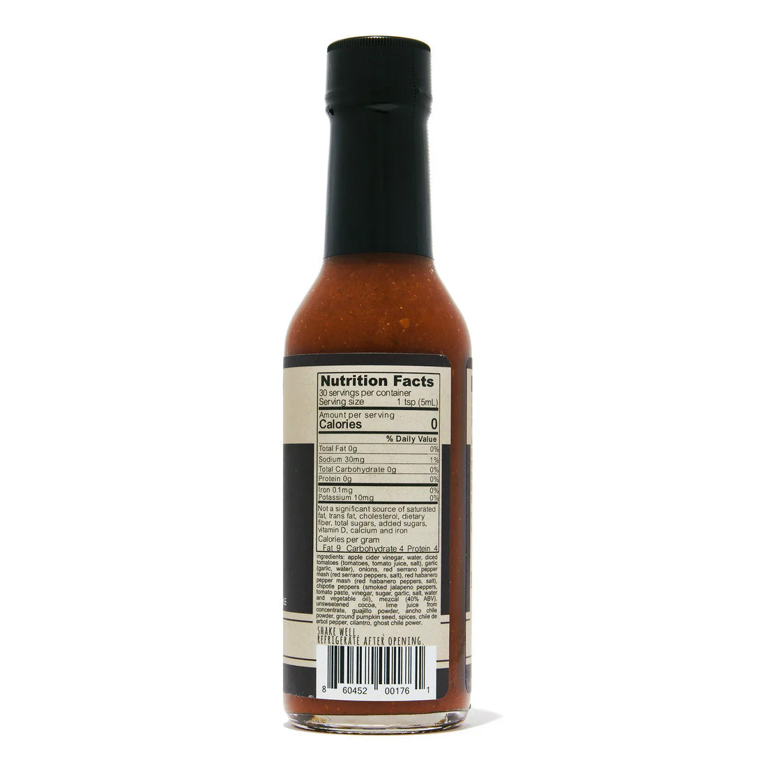 • Contains Apple cider vinegar, water, diced tomatoes (tomatoes, tomato juice, salt), garlic (garlic, water), onions, red serrano pepper mash (red serrano peppers, salt), red habanero pepper mash (red habanero peppers, salt), chipotle peppers (smoked jalapeno peppers, tomato paste, vinegar, sugar, garlic, salt, water, and vegetable oil), mezcal (40% ABV), unsweetened cocoa, lime juice from concentrate, guajillo powder, ancho chile powder, ground pumpkin seed, spices, chile de arbol pepper, cilantro, ghost chile powder.
