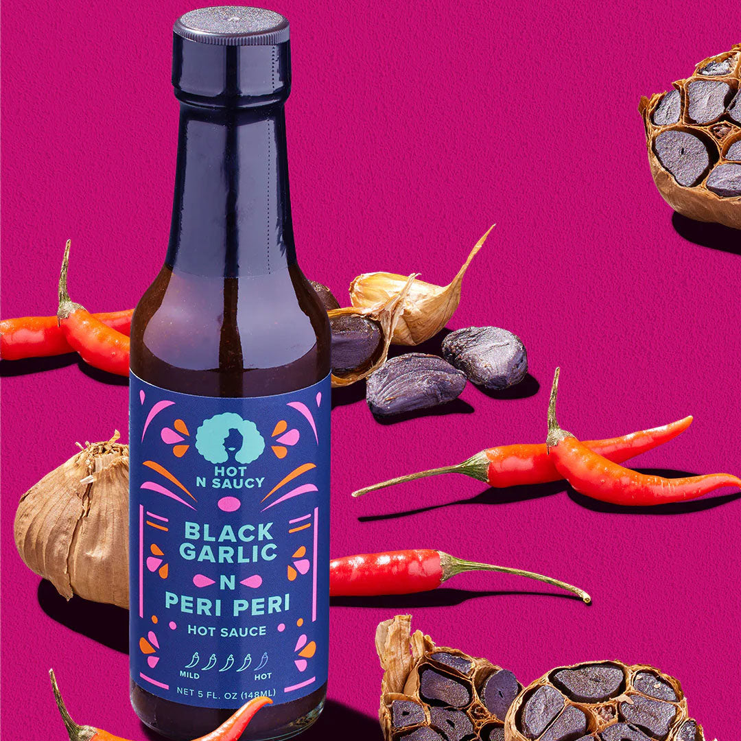 Our Black Garlic N Peri Peri sauce is the perfect blend of robust, bold umami, black garlic and West African Peri Peri peppers. Spice up any dish with a perfect balance of heat and flavor. Our all-natural, preservative-free sauce is sure to take any meal to the next level.  Entice your mouths and eyes with this black hot sauce.