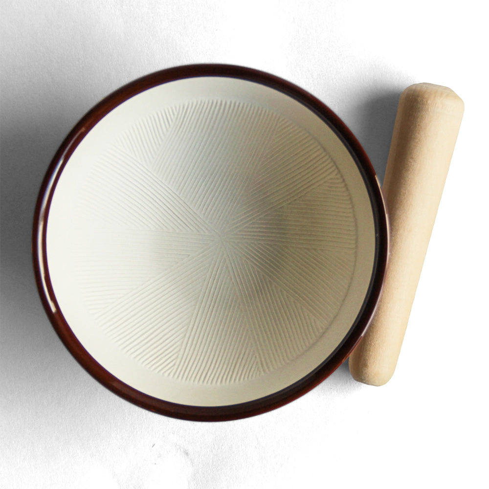 Suribachi, meaning ‘grinding bowl’ and its accompanying wooden surikogi are a traditional Japanese mortar and pestle. Small ridges carved into the ceramic bowl, called kushi-no-me, are ideal for no-fuss grinding of seeds, nuts, and spices. Perfect for whole spices, suribachi are also wonderful for pesto, spice pastes, and other sauces! Place on non-skid surface for vigorous grinding, like a cutting board or damp kitchen cloth.