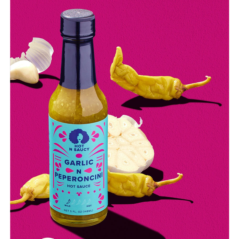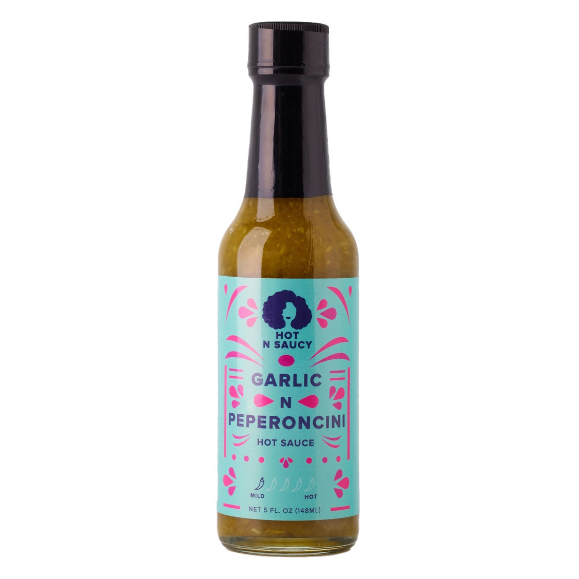 Garlic N Peperoncini is the #1 seller, a celebrity favorite, and seen on Hot Ones. It has an approachable and mild flavor with a pleasant sweet and tangy mix, making it great for dipping, pouring on all types of food, or using in recipes. This sauce is guaranteed to become one of your favorites and replace your old faithful hot sauce.