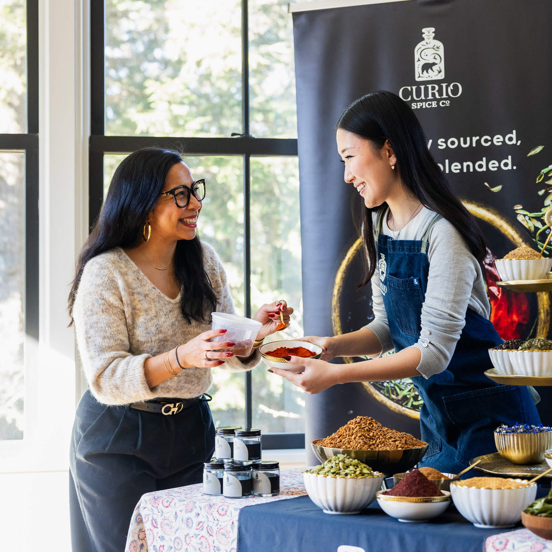 Curio Spice Co comes to your company or venue for an on-flow activation of spice blending over 2-3 hours. Participants get a crash course on the spice blending philosophy and then create their own spice blend using 2 dozen+ spices set up as a blending bar. Each blend is ground and jarred and guests leave with their own custom spice blend and a Spice Flavor wheel.