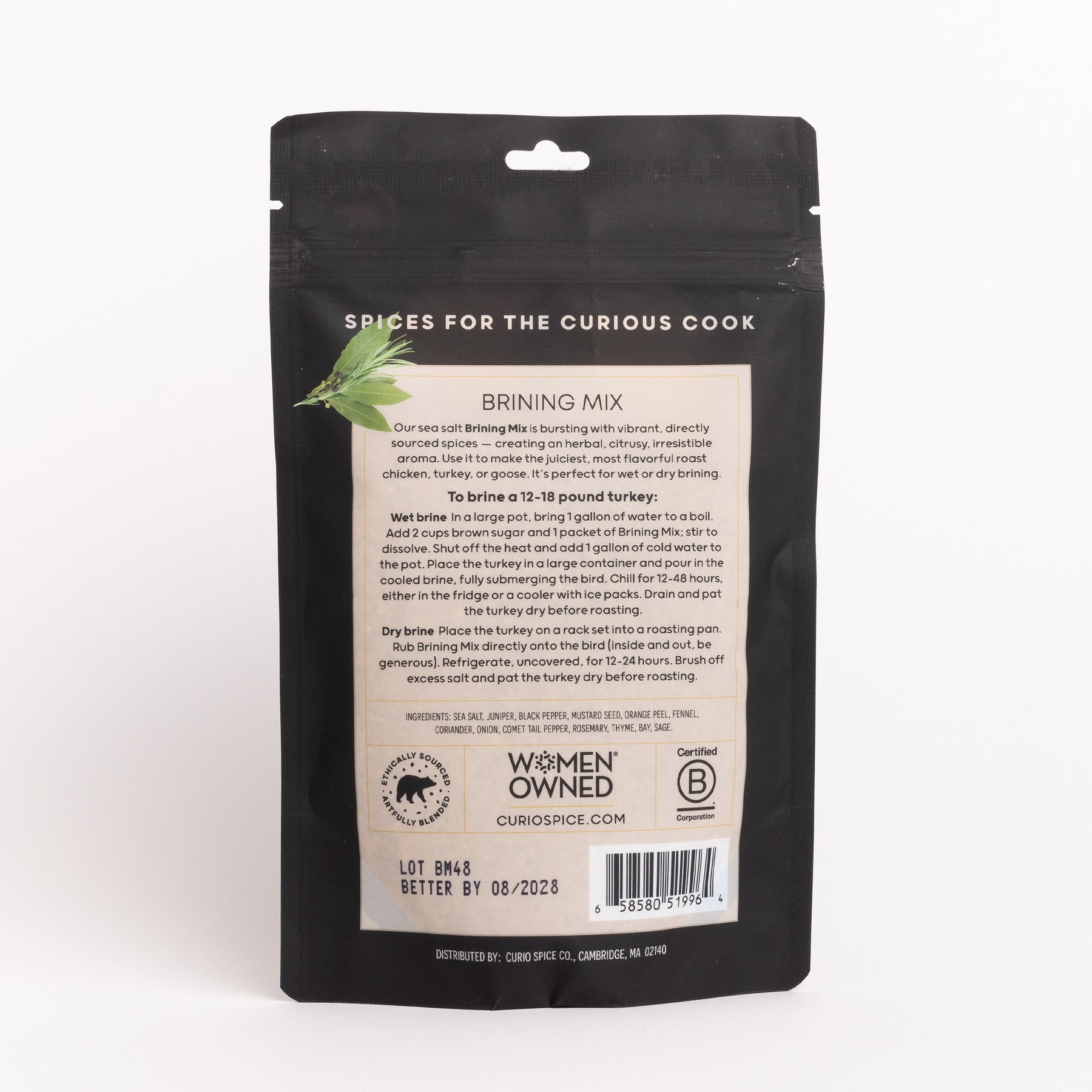 Brining before roasting helps to ensure that your holiday bird is moist and well-seasoned. Our brining spices make the perfect addition to either a wet or dry brine for a 12–18 pound turkey - just follow the simple instructions included on the package. Also great for brining chicken or finishing steak.